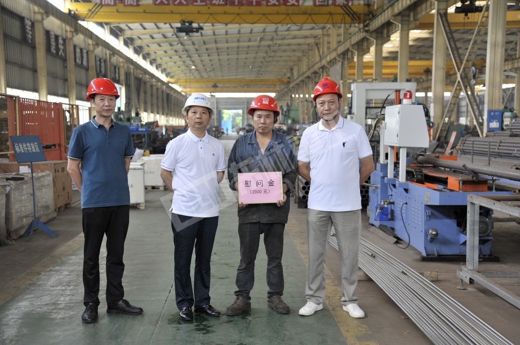Donglin heavy industry company leaders learned that the sheet metal welding workshop front-line staff Li Liangmin's son was seriously ill in hospital treatment, due to the outbreak can not be admitted to hospital to visit, July 23 at around 10:00 am, xiao Yangdong, Secretary of the company's Party branch and general manager, and Jiang Minggang, chairman of the trade union, together with the staff of the administrative department, formed a sympathy group to come to the front line of the workshop before Li Liangmin's work, i personally send my love and sympathy to Donglin.